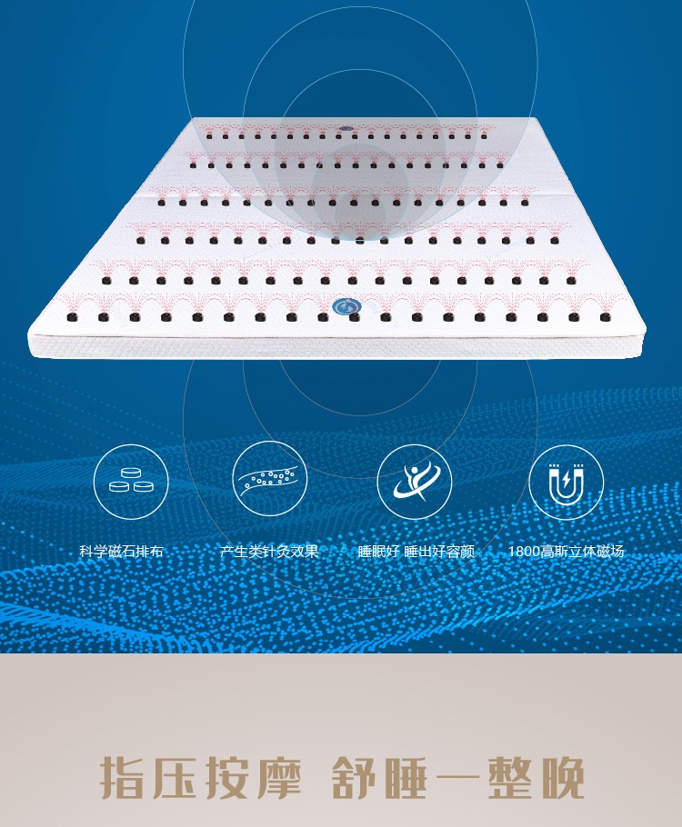 描述:不朽情缘MG游戏床垫采用托玛琳功能层、恒定能量磁场层、进口环保架桥按摩层、抗菌防螨功能层等13层复合材料结构、400颗磁石、100个磁架形成聚能立体磁场组,产生恒定磁场、符合弹性按摩垫、突球型设计人躺在上面能持续享受类指压按摩效果,竹炭纤维吸附身体产生的异味辅助负氧离子让卧室跟清新,让你尽情享受好睡眠。